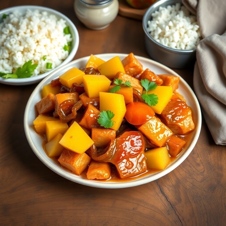 Un plato jugoso de cerdo con una dulce y ácida salsa de piña y cebollas caramelizadas, ideal para una cena rápida y llena de sabor.