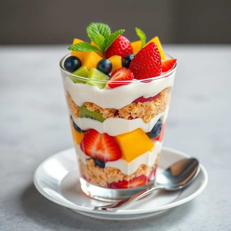 Un postre en capas estilo parfait que combina la frescura de frutas variadas, la suavidad de la nata montada con leche condensada y la textura crujiente de galletas, ideal para una presentación elegante y sencilla.