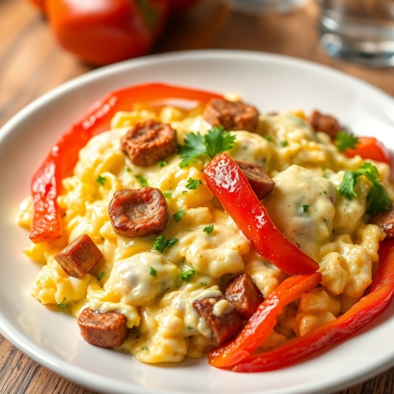 Un revuelto cremoso y colorido, ideal para un desayuno energético o una cena rápida, con un toque ahumado del chorizo y la dulzura de los pimientos asados.