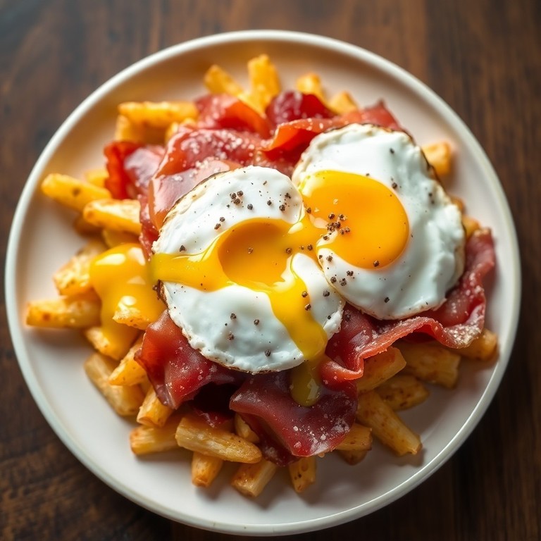 Clásico plato español que combina patatas crujientes, huevos estrellados con yema líquida y jamón ibérico aromático. Ideal para un desayuno o almuerzo reconfortante que destaca por su sencillez y sabor intenso.