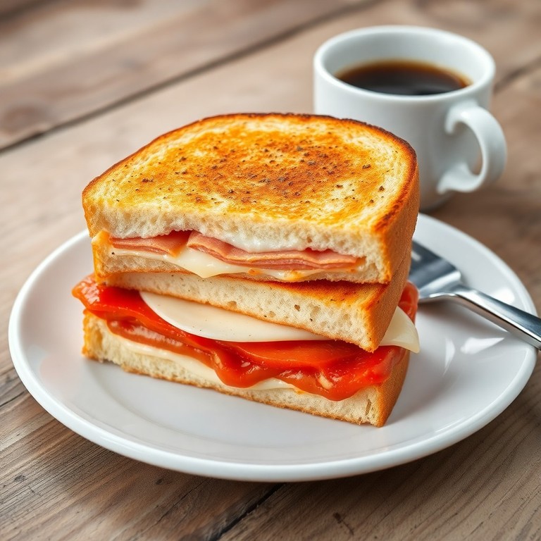 Capas de pan de molde con jamón, queso y tomate frito, horneadas hasta dorar, un desayuno caliente y reconfortante. Perfecto para comenzar el día con un plato sencillo pero lleno de sabor y textura.