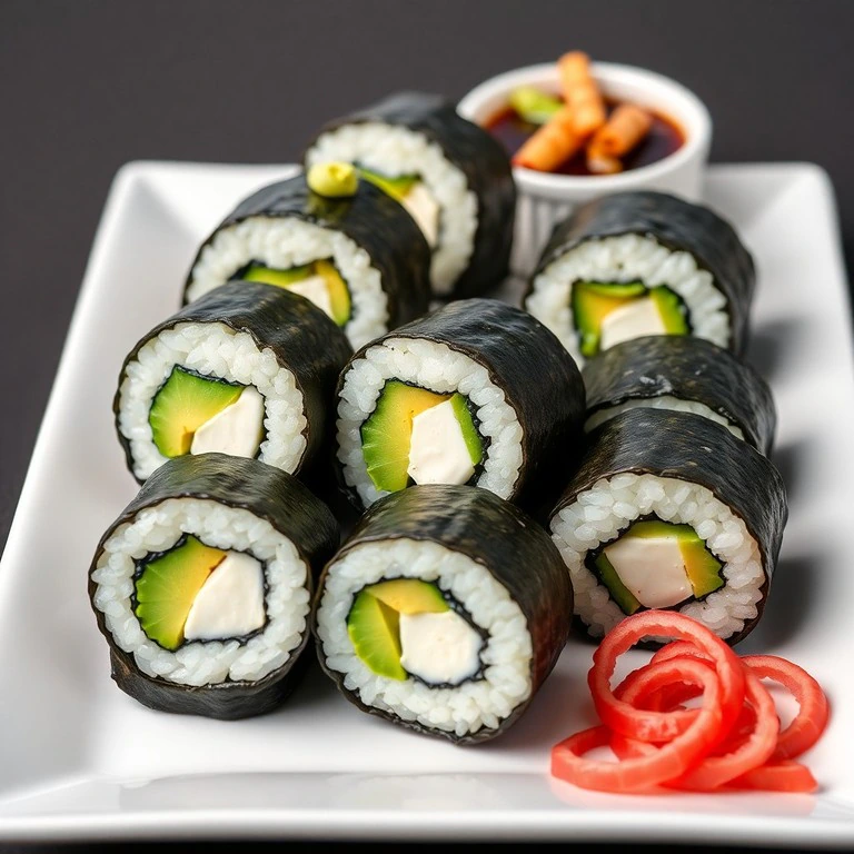 Deliciosos rollitos de arroz envueltos en alga nori, rellenos de palta cremosa y queso crema, ideales como aperitivo rápido y elegante para cualquier ocasión.