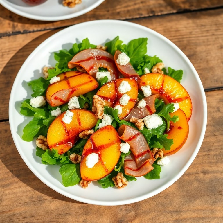 Una ensalada fresca y jugosa que combina duraznos asados con jamón curado, hojas verdes y queso de cabra, aliñada con un aderezo dulce y ácido. Perfecta para un almuerzo liviano y rápido, que resalta la armonía entre sabores dulces y salados.