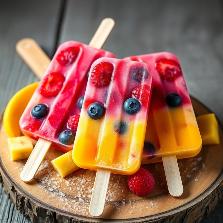 Un helado de palito con colores vibrantes en rojo, amarillo y azul, elaborado con frutas frescas como cerezas, plátano, mango, arándanos y frambuesas. Esta receta combina la textura cremosa del yogur con trozos de fruta natural para un postre saludable, divertido y refrescante, ideal para los días cálidos.