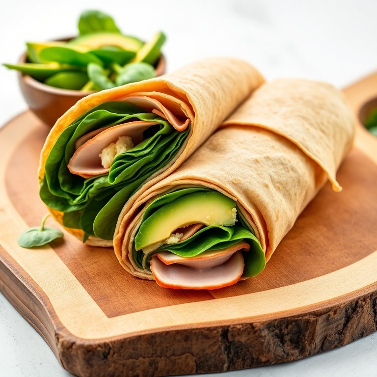 Un rollo saludable que incorpora rebanadas de pavo magro, aguacate cremoso y espinacas frescas en una tortilla integral, ideal para una comida ligera, rápida y nutritiva.