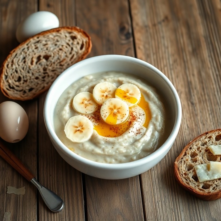 Un desayuno nutritivo y rápido de avena cocida con rodajas de plátano y un toque de miel, ideal para comenzar el día con energía en solo 10 minutos. Se acompaña con huevo cocido y pan integral con queso para un aporte completo de nutrientes.