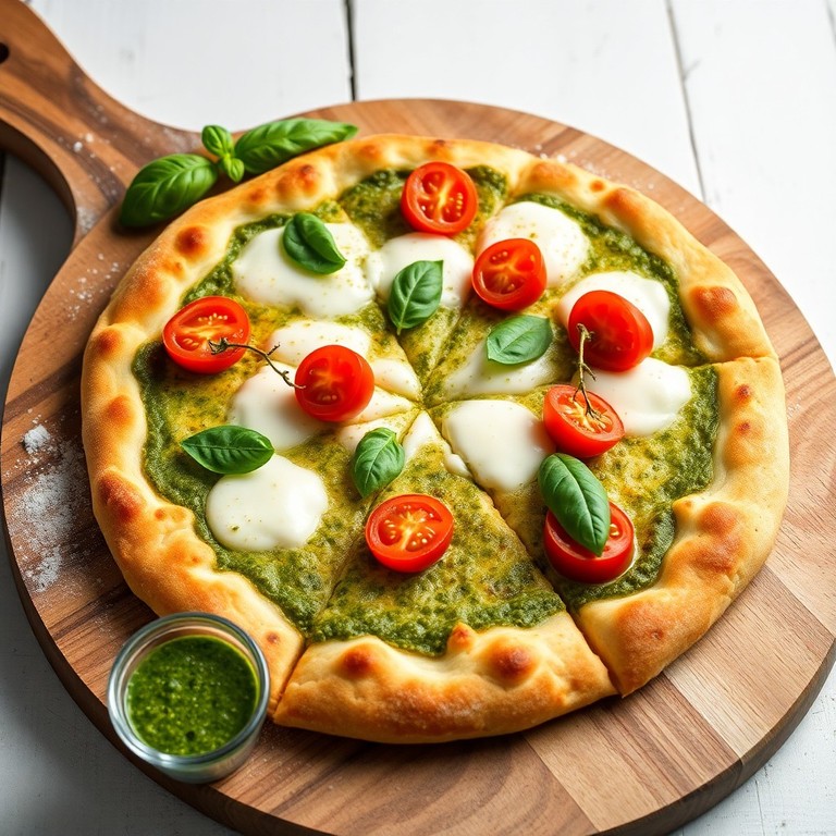 Una pizza clásica y deliciosa que combina una masa crujiente con un pesto fresco hecho con albahaca, piñones, ajo, queso parmesano y aceite de oliva. Fácil de preparar y lista en 15 minutos de horneado, es perfecta para quienes buscan una opción sabrosa y aromática.