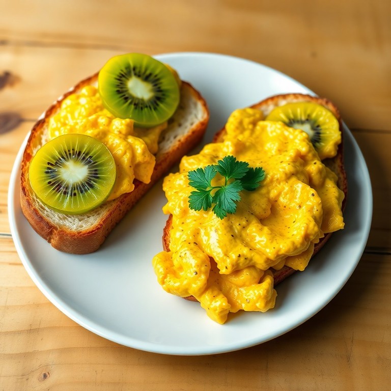Una mezcla exótica de sabores con huevos revueltos condimentados con curry, acompañados de kiwi para una nota frutal, ideal para un desayuno rápido y vitamínico.