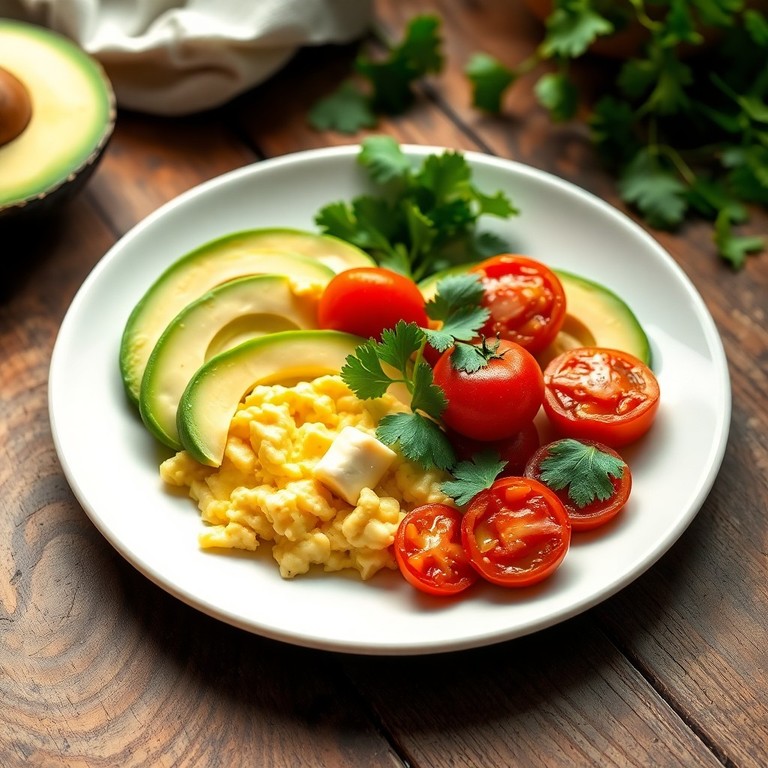Un desayuno saludable y nutritivo con huevos revueltos cremosos acompañados de rodajas de aguacate fresco y tomates cherry salteados, ideal para comenzar el día con energía.