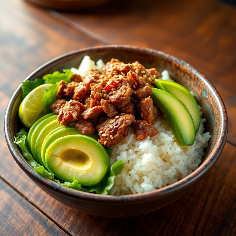 Un bol asiatique savoureux combinant du riz jasmin moelleux, du bœuf haché épicé et croustillant, des tranches d'avocat frais et une salade croquante, relevé par une touche de citron vert et de graines de sésame. Parfait pour un repas équilibré et rapide, prêt en 30 minutes.