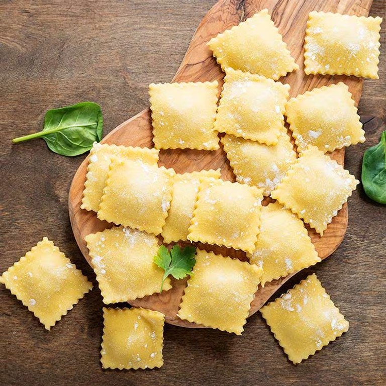 📝 DESCRIPCIÓN DEL PLATO: Estos ravioles combinan la suavidad de una masa fresca con un relleno aromático de camarón y curry, resultando en un contraste de sabores especiados y marinos. La salsa cremosa de mariscos, rica y untuosa, potencia la experiencia, convirtiendo este plato en una opción ideal para almuerzos o cenas elegantes donde se desea destacar técnicas de elaboración de pasta fresca rellena.