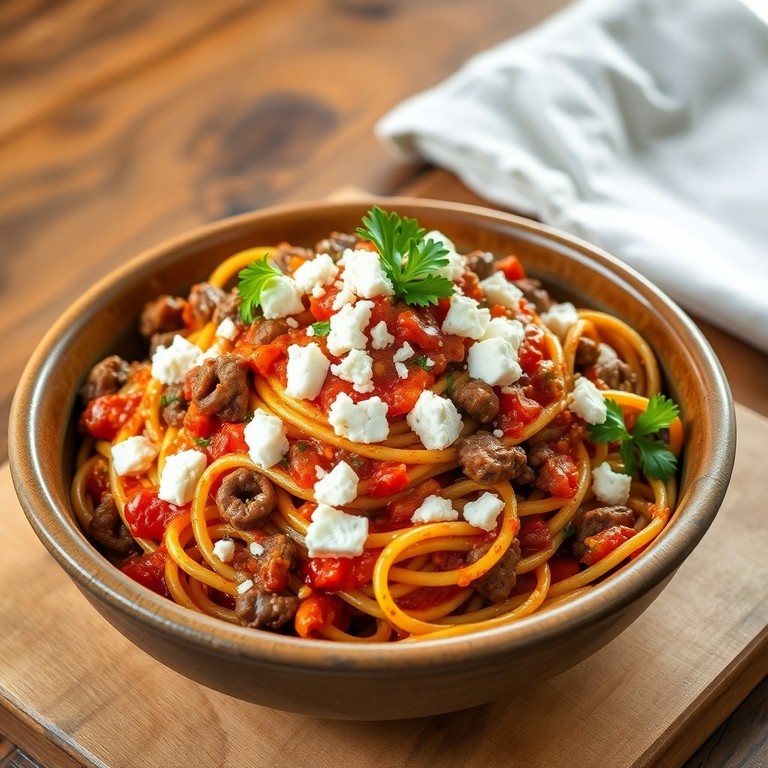 A quick and healthy skillet recipe combining seasoned spaghetti noodles with savory ground beef, tangy feta cheese, and vibrant Mediterranean spices. This dish brings a fresh twist to classic spaghetti by stir-frying the noodles with ground hamburger and finishing with creamy feta crumbles for a delightful balance of flavors and textures.