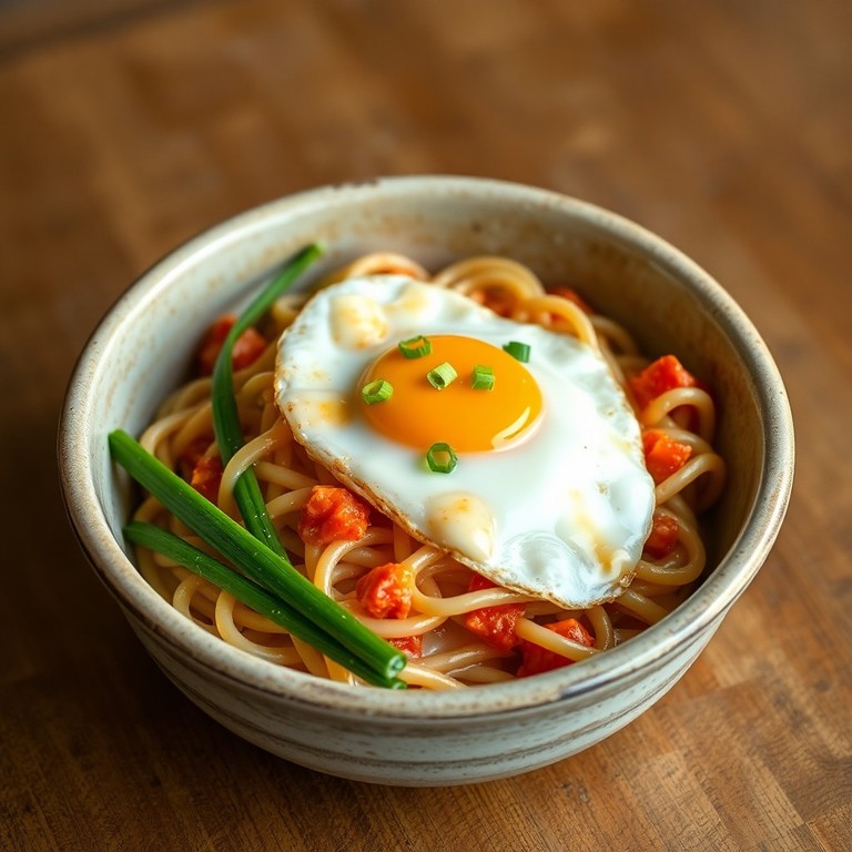 A rich and tangy fusion dish combining spicy kimchi with creamy cheese and butter, delivering a perfect balance of heat and indulgence. This quick and comforting noodle recipe is elevated by a luscious cream sauce and a silky egg, making it a satisfying meal ready in under 30 minutes. Ideal for those who love bold flavors with a creamy twist.