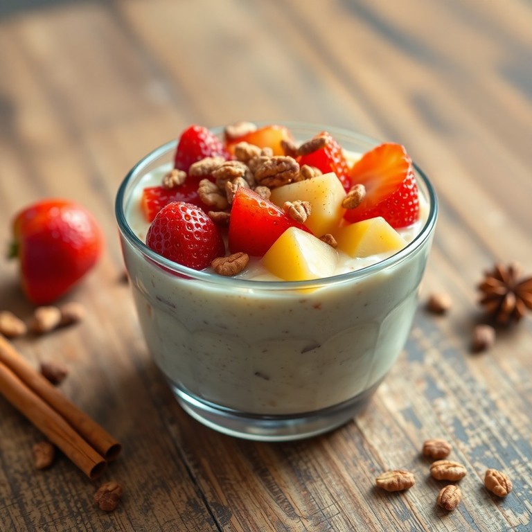 Una copa de avena cremosa cocida a la perfección, acompañada de frutas frescas de temporada y nueces crujientes. Esta receta es una opción reconfortante y energética para empezar el día con un desayuno nutritivo y delicioso.