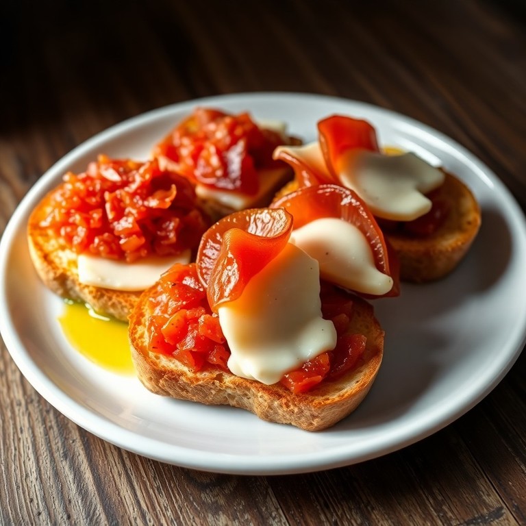 Una tradicional tapa española que combina la intensidad del jamón ibérico de bellota con el sabor curado del queso manchego y la frescura del tomate, ideal para un aperitivo rápido y delicioso.