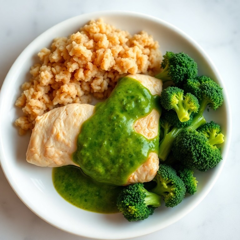 Pollo en salsa verde con brócoli al vapor y arroz integral