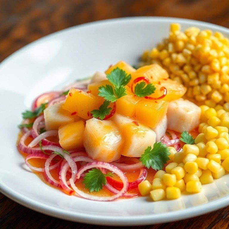 Un ceviche refrescante inspirado en sabores peruanos, que combina cubos frescos de pescado macerados en jugo de tumbo y ají limo picante, acompañado de brotes comestibles, cancha crocante y choclo tierno. Esta receta rápida y vibrante captura la esencia del ceviche tradicional con un toque frutal y picante, ideal para disfrutar en cualquier ocasión.