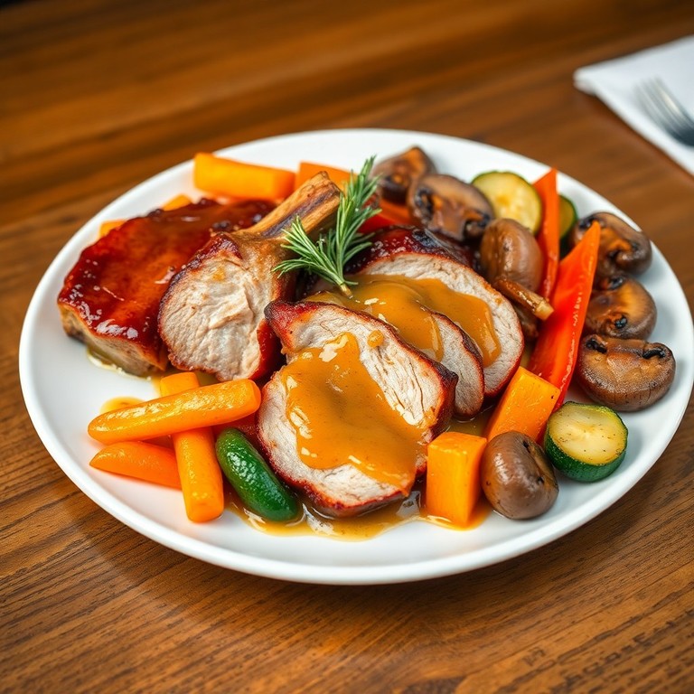 Lomo de cerdo a la miel con salsa de whisky y vegetales asados