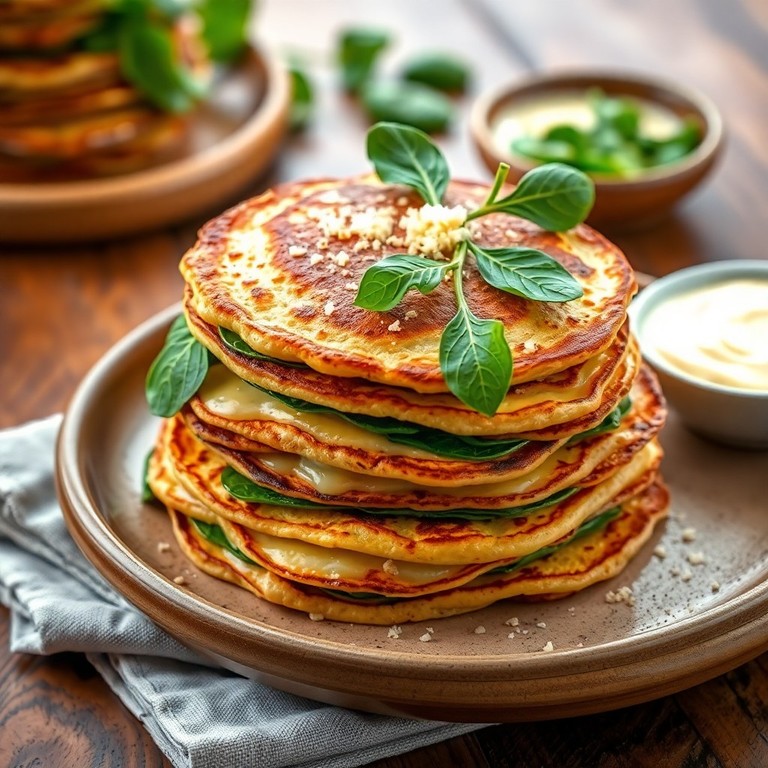 Deliciosas tortitas con queso fundido y espinaca fresca, fáciles de preparar, perfectas para un desayuno nutritivo o brunch. Estas tortitas saladas combinan la suavidad del queso derretido con el sabor fresco y ligero de la espinaca, envueltas en una masa tipo panqueque salado que las hace irresistibles y muy versátiles.