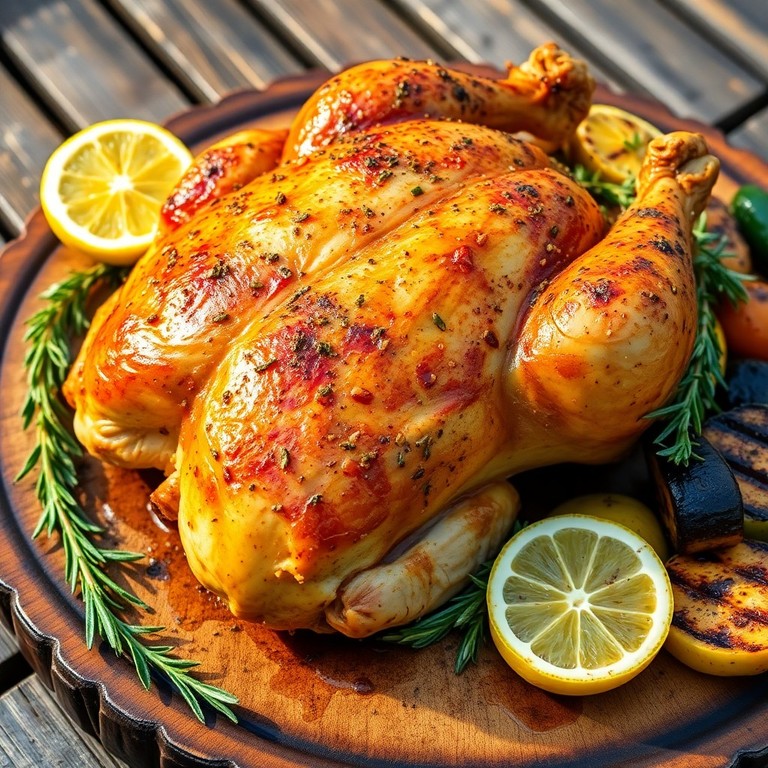 Un delicioso pollo entero marinado en una mezcla aromática de hierbas provenzales, ajo y limón, cocinado a la parrilla para obtener un sabor ahumado y jugoso. Ideal para comidas al aire libre, este plato combina la frescura de las hierbas con la intensidad del fuego para un resultado irresistible.