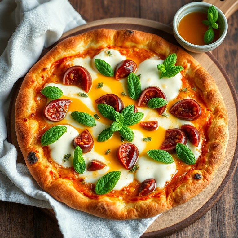 Una pizza dulce y exótica que combina la acidez y frescura de la fruta de la pasión con la suavidad cremosa del queso Camembert, realzada con un toque refrescante de menta. Ideal para sorprender a tus invitados en reuniones especiales con una opción diferente y sofisticada.
