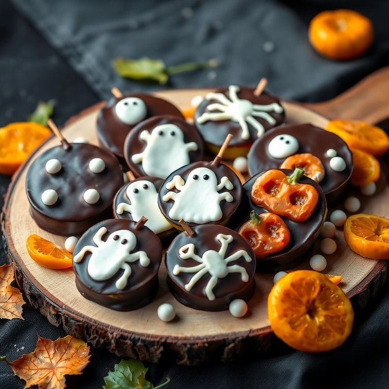 Deliciosas rodajas de manzana cubiertas con chocolate negro fundido y decoradas con motivos de Halloween, ideales para un postre divertido y atractivo para niños. Este postre combina la frescura de la manzana con la intensidad del chocolate negro, y se complementa con detalles temáticos que incluyen mandarinas para aportar un toque cítrico y colorido.