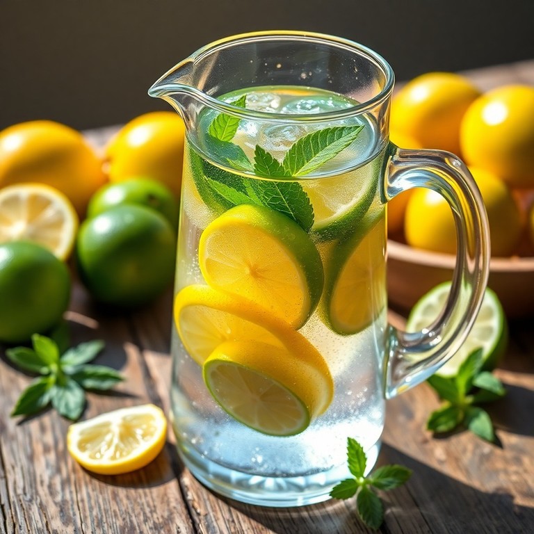 Una refrescante agua alcalina infusionada con cáscaras de limón y lima, acompañada de ramitas frescas de menta que aportan un aroma y sabor únicos. Esta bebida es ideal para hidratarse de forma saludable, con un toque cítrico y herbal que la hace especial y revitalizante.