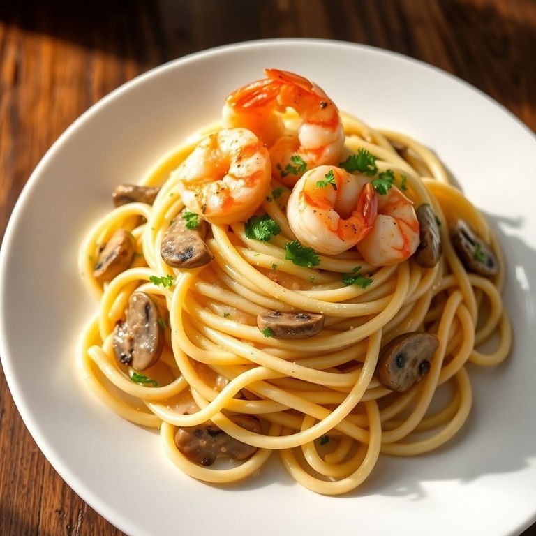 Una receta italiana clásica que combina tallarines al dente con camarones salteados y una suave salsa cremosa de champiñones. Perfecta para un almuerzo elegante y reconfortante, esta preparación destaca por su equilibrio entre sabores delicados y texturas cremosas.