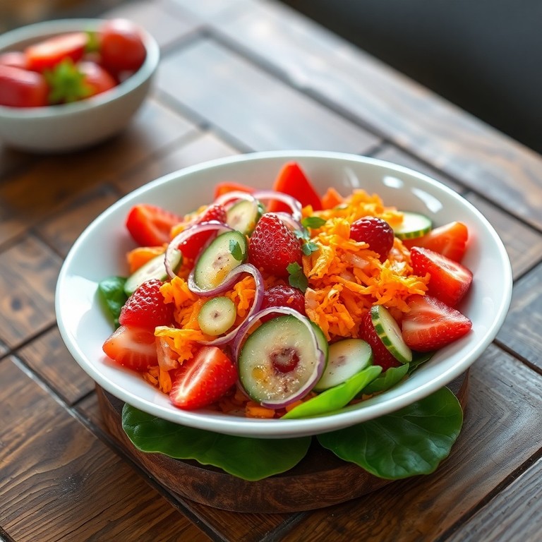 Una ensalada fresca y colorida que combina la dulzura de las fresas con la textura crujiente de la zanahoria, pepino y cebolla, acompañada de una vinagreta de miel que realza todos los sabores. Perfecta para un almuerzo ligero y nutritivo, esta ensalada se prepara en solo 10 minutos, ideal para quienes buscan una opción saludable y deliciosa.