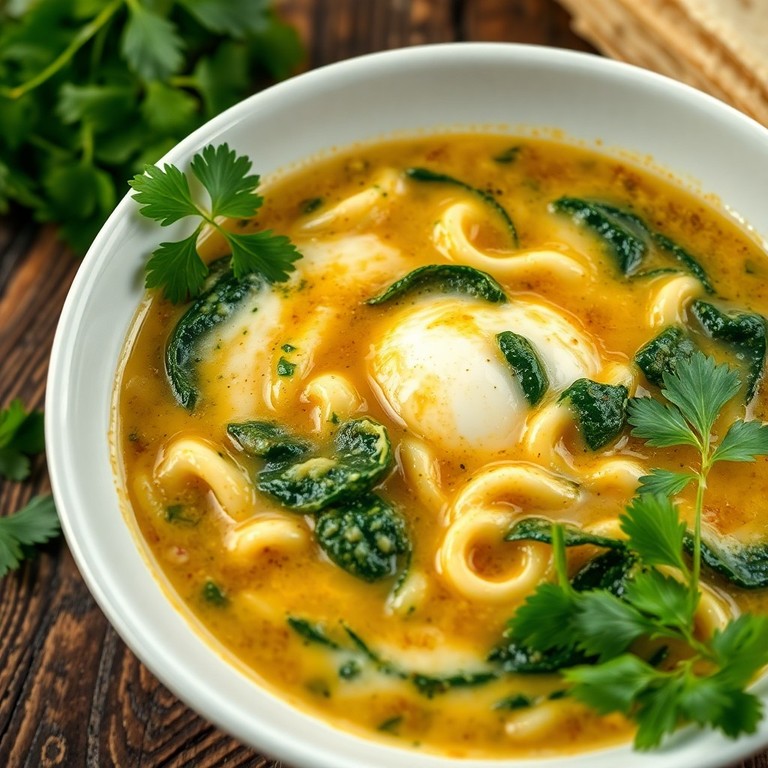 Esta versión caliente de la tradicional sopa de espinaca y huevo ofrece la misma combinación de sabores frescos y cremosos, pero servida tibia para disfrutar en días más frescos o cuando se desea una sopa reconfortante.