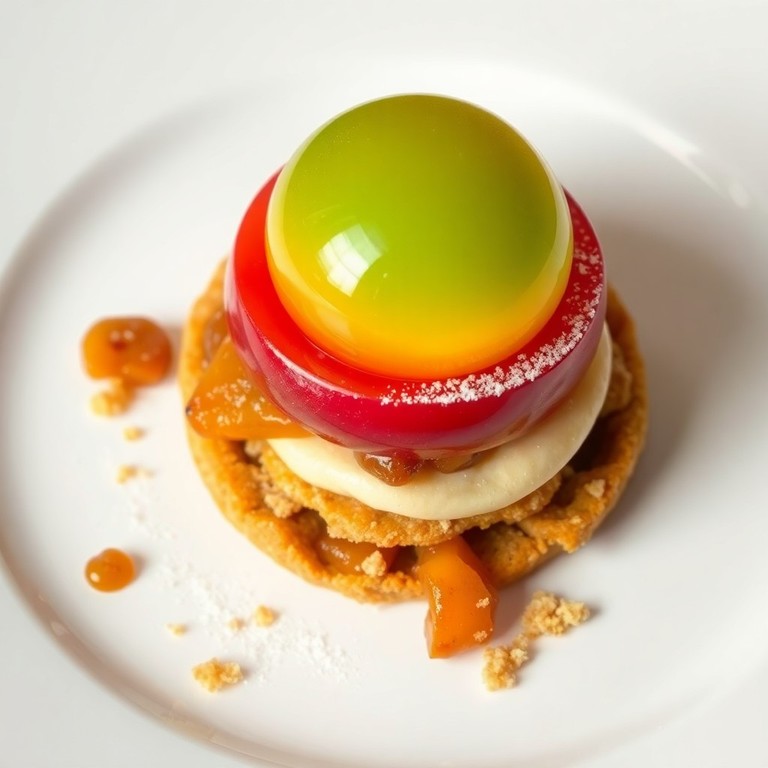 Este postre es una elegante combinación de texturas y sabores que celebra la manzana en todas sus formas. La base es una galleta casera con sabor a manzana, sobre la cual se disponen capas de manzana asada y un puré suave de manzana asada. Encima, una semiesfera gelificada de helado que fusiona manzana verde y roja aporta frescura y contraste, rematada con una delicada gelatina y un toque crujiente que realzan la experiencia.