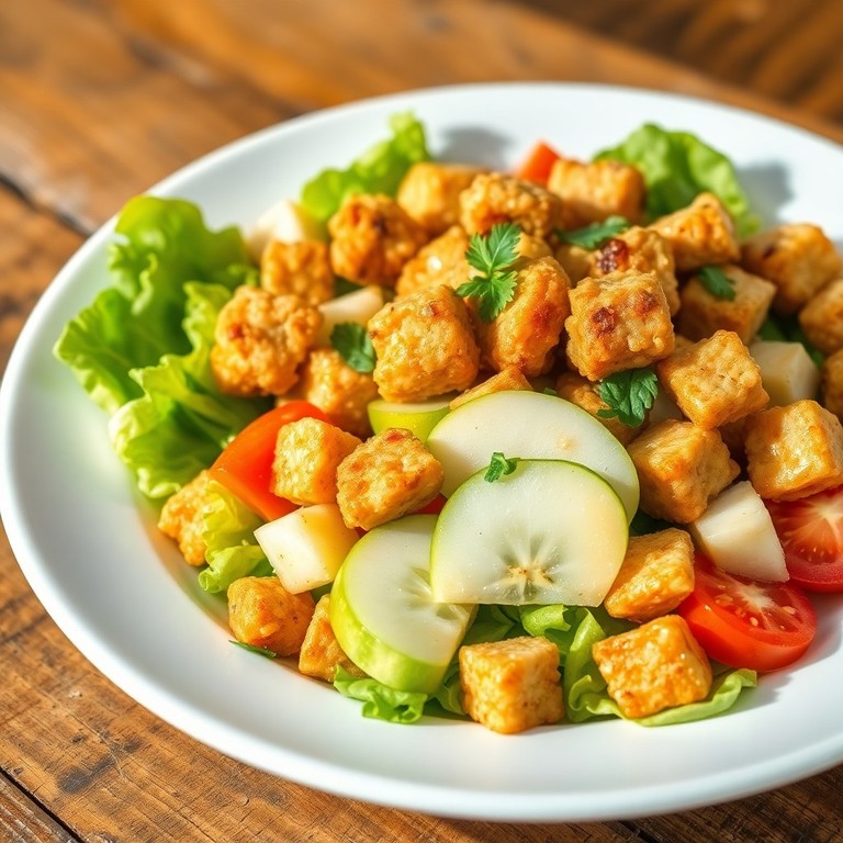 Una ensalada crujiente y refrescante que combina manzana, pepino, jitomate y lechuga, acompañada de nuggets de pollo dorados y una vinagreta aromática de hierbas. Ideal para un almuerzo ligero y lleno de sabor, esta receta ofrece un balance perfecto entre texturas y frescura.