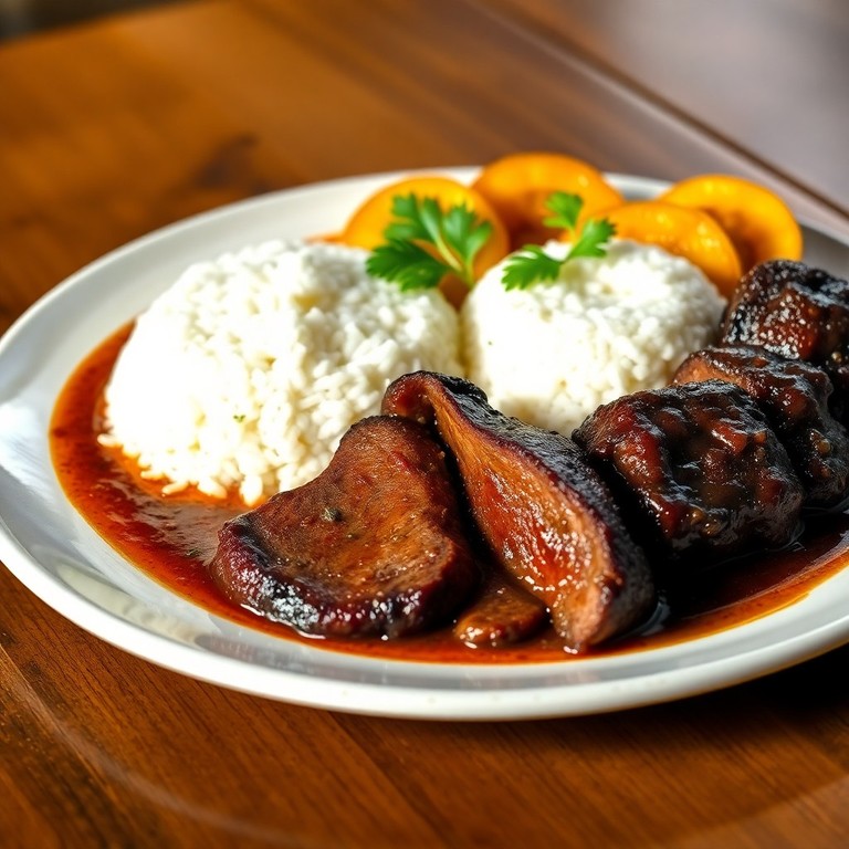 Un delicioso estofado de carne en salsa oscura, servido con arroz blanco y plátanos maduros fritos, que refleja la riqueza de la gastronomía venezolana.