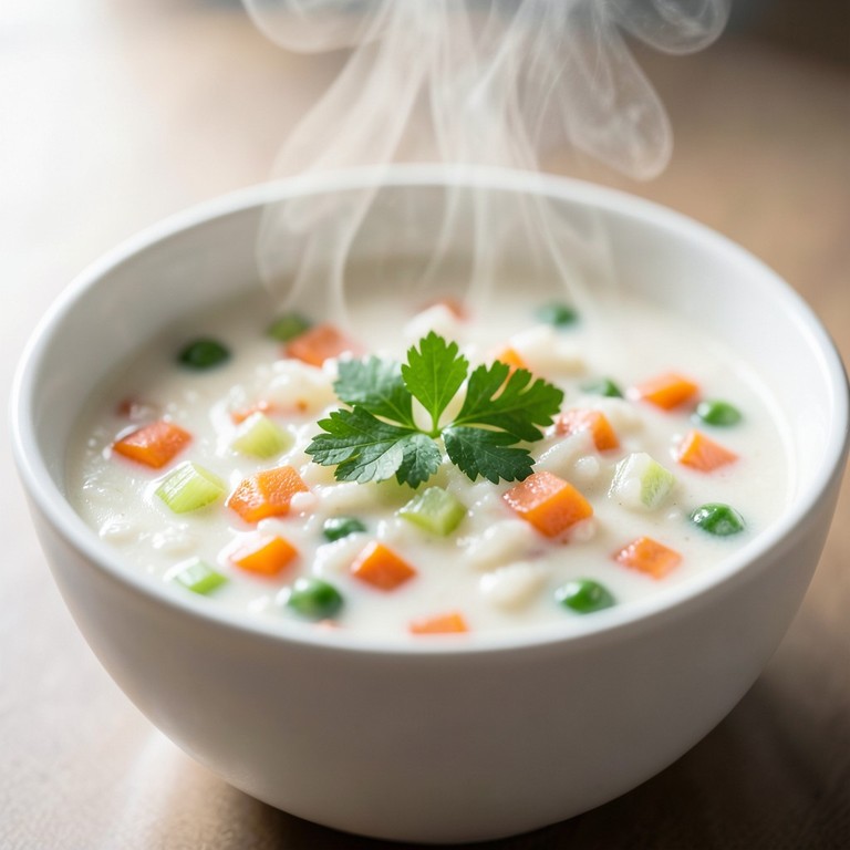 Una sopa reconfortante y sustanciosa con arroz blanco cocido en un caldo suave, enriquecida con un toque de crema y una mezcla de verduras frescas picadas.