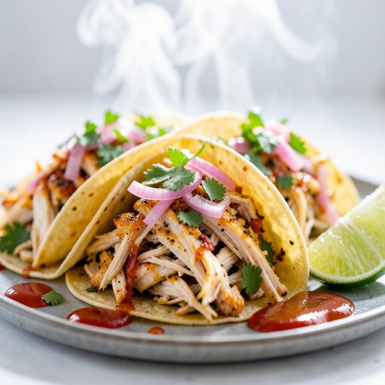 Pollo cocido desmenuzado salteado con especias en tortillas calientes, listo en minutos para una comida rápida y deliciosa.