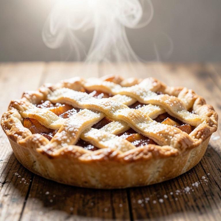 Una tarta de manzana tradicional con un relleno de manzanas caramelizadas y especiadas, cubierta con una hermosa y crujiente rejilla de masa quebrada.