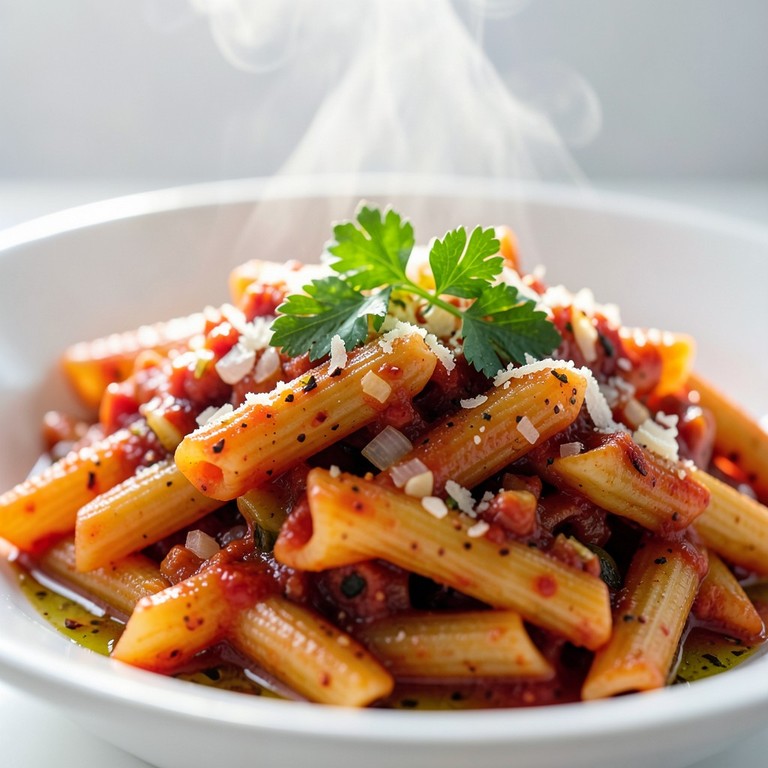 Una salsa de tomate suavemente picante con ajo y cebolla, perfecta para acompañar la pasta penne, ofreciendo un toque de calor equilibrado.