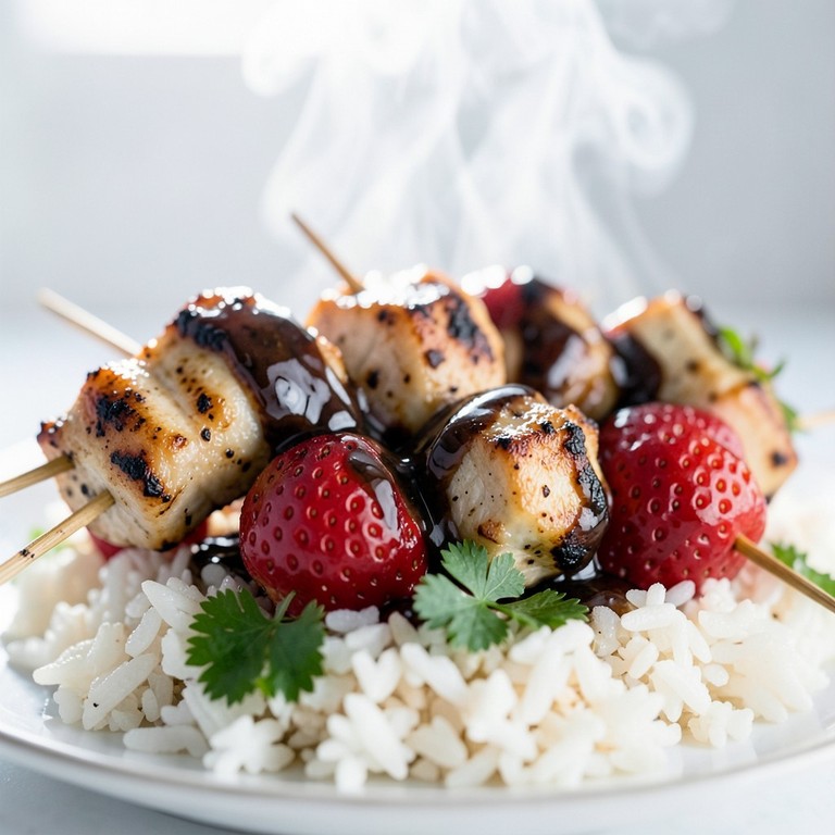 Brochetas de pollo y frutillas frescas a la parrilla, bañadas con un glaseado aromático de café, servidas sobre arroz.