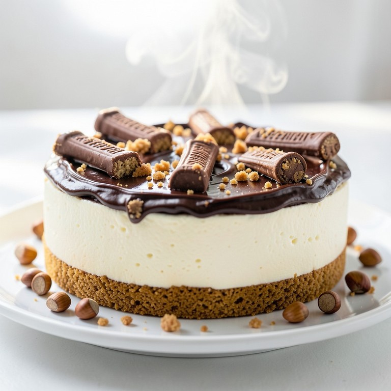 Un delicioso cheesecake sin horno con una base crujiente de galleta, un relleno suave y cremoso de queso y trozos de Kinder Bueno, coronado con una rica cobertura de crema de avellanas y más Kinder Bueno. Perfecto para compartir en grandes reuniones.