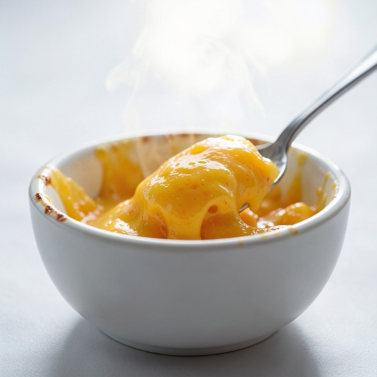 Una porción de queso derretido y burbujeante, ideal para acompañar o disfrutar solo, preparado rápidamente en el microondas.