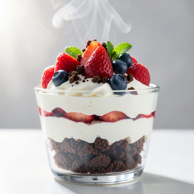 Un postre decadente con capas de crumble de chocolate crujiente (simulando piedras), crema batida suave y bayas frescas vibrantes (el bosque), creando una experiencia deliciosa y visualmente encantadora.