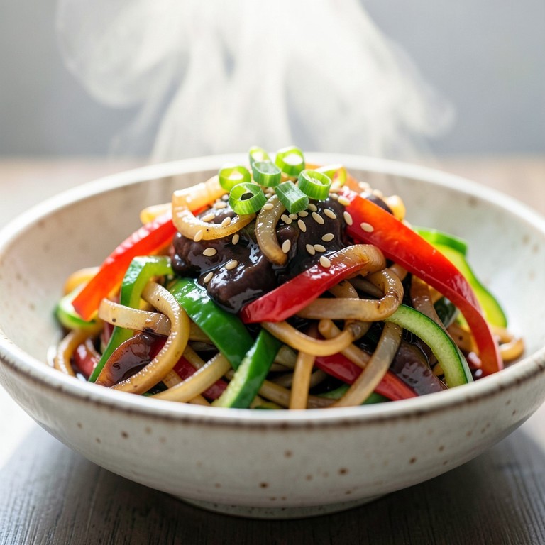 Un clásico salteado asiático con fideos, pimientos, calabacín y cebolla, perfecto para una comida rápida, sabrosa y llena de color.