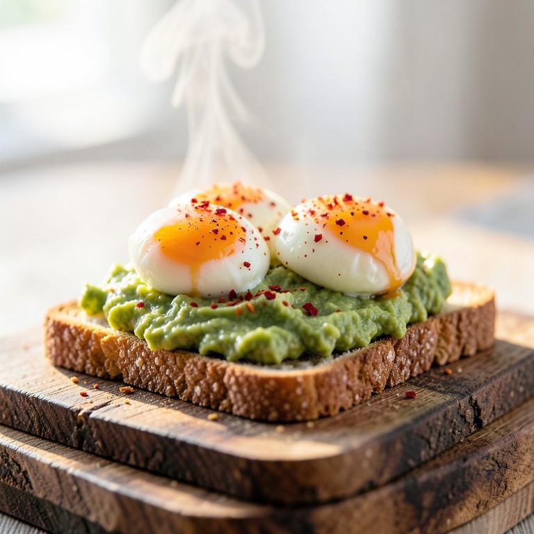 Pan integral tostado con aguacate cremoso, coronado con un huevo poché y un toque de chile en hojuelas para un inicio de día sustancioso.
