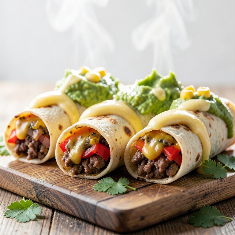 Una mezcla sabrosa de carne molida, pimentón y cebolla, envuelta en tortillas y bañada con salsas de queso, guacamole y maíz dulce.