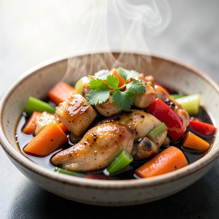 Un reconfortante guiso donde el pollo se cocina lentamente con vegetales frescos y una rica salsa de soya, realzado con un sutil aroma a canela china y jengibre.