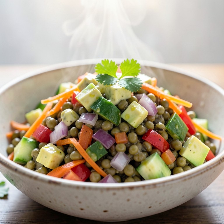 Una ensalada refrescante y nutritiva con lentejas tiernas, cebolla morada crujiente, pimentón dulce, zanahoria, pepino fresco y cremoso aguacate, todo aderezado con una vinagreta de limón vibrante.