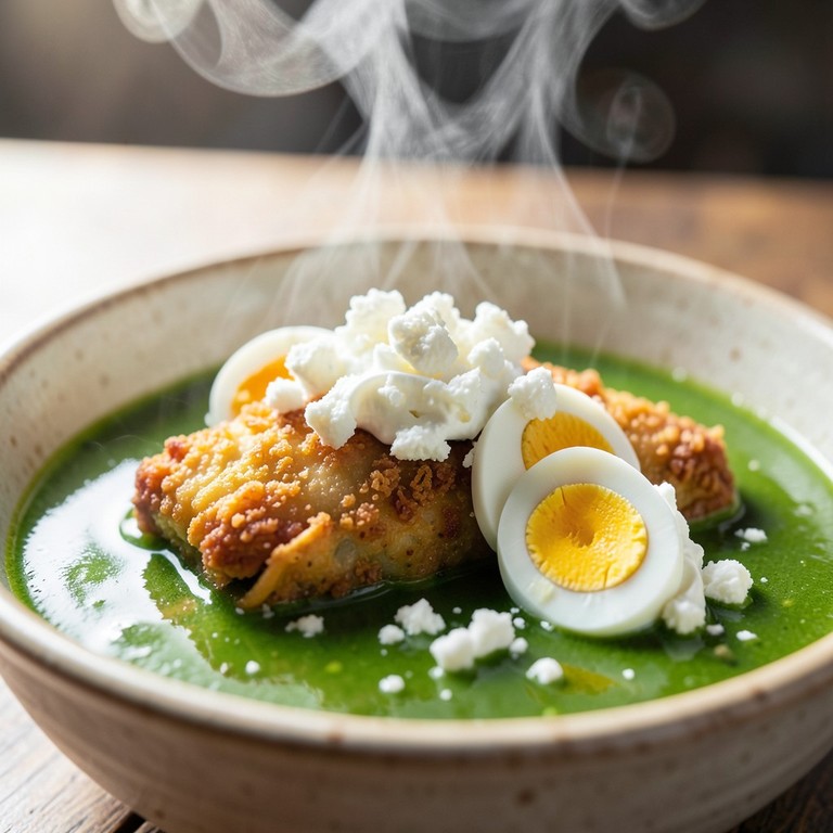 Una combinación reconfortante de tacos dorados de pollo crujientes, servidos en un vibrante y aromático caldo verde, coronados con huevo duro y crema.