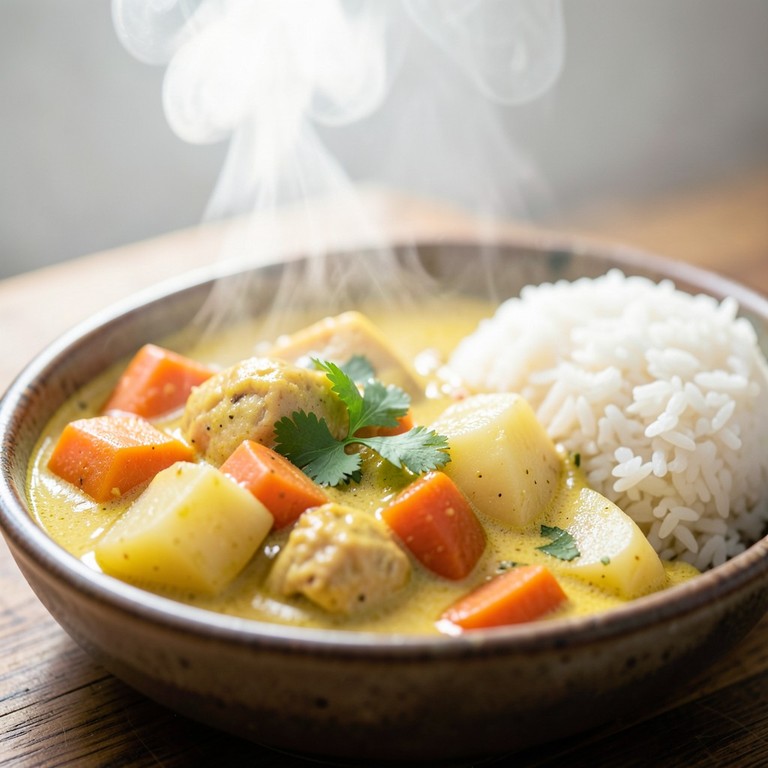 Un curry aromático y saludable con pechuga de pollo, zanahoria y papa en una salsa ligera de coco, acompañado de arroz blanco y aguacate.