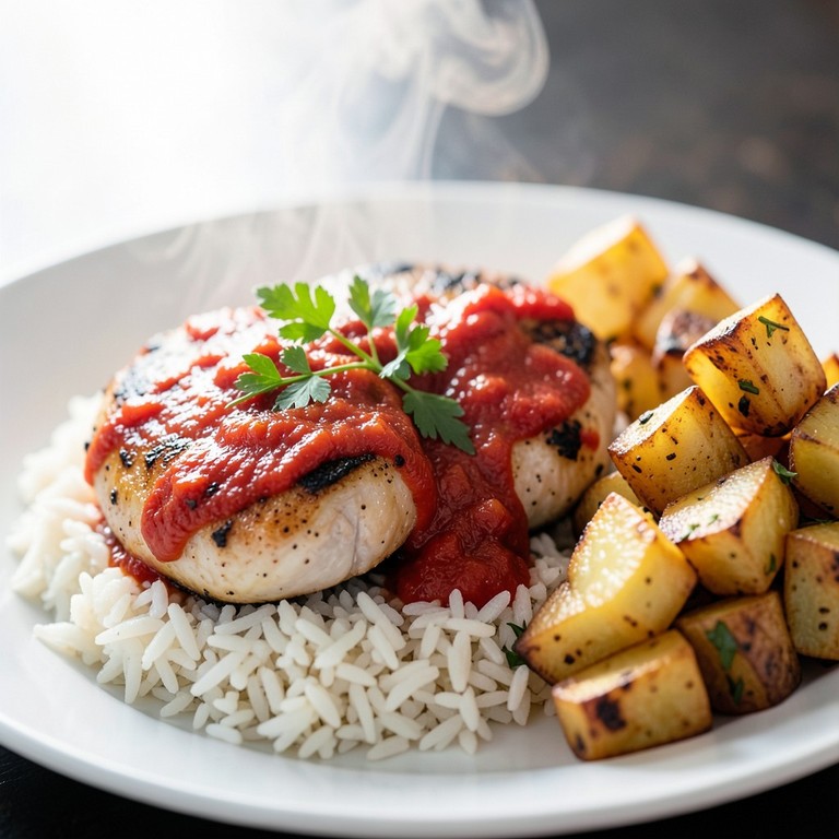 Una comida completa y reconfortante con pechugas de pollo tiernas cocinadas en una rica salsa de tomate, acompañadas de arroz blanco esponjoso y papas asadas crujientes y doradas.