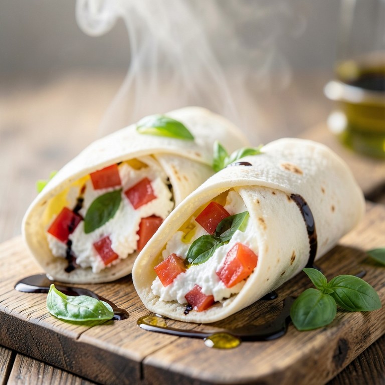 Un wrap ligero y saludable que combina la cremosidad de la ricota con la frescura de los tomates y el aroma inconfundible de la albahaca, ideal para una comida rápida y nutritiva.